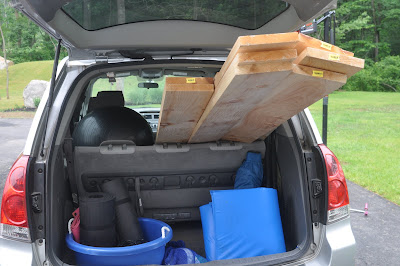 Two small tables about to be made into one BIG table, a million dining room chairs, exercise equipment for bootcamp, a buffet that is being refinished, and oodles of kid junk…