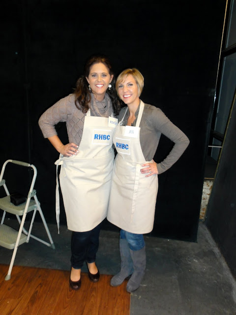 I honestly had no idea that Monica and I matched so exactly. We were literally just running on adrenaline at this point, and I guess we’re just lucky we remembered to put ANYTHING on under those aprons. Speaking of the aprons….could anything be less attractive? But we were thrilled to have our blog initials thrown in there for all to see. (We’re so not afraid of the shameless plug! 🙂