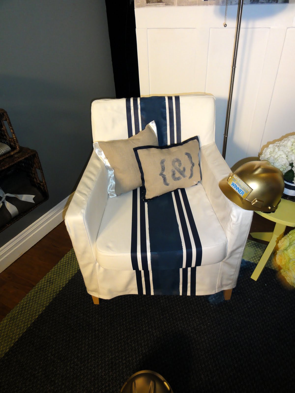 perfect stripe painting method, we added navy blue stripes to our chair and whipped up two little pillows to throw on there. The stencil was a last-minute addition, which we LOVED.