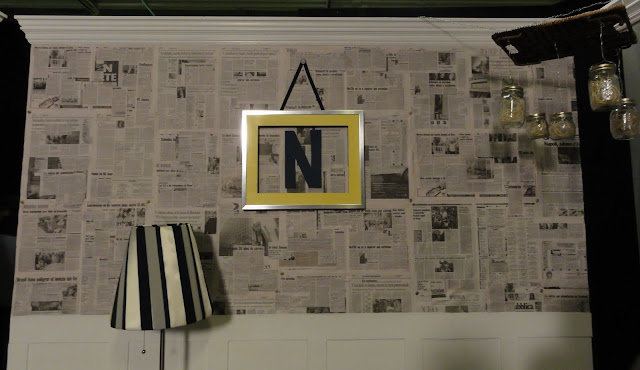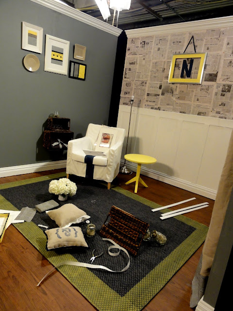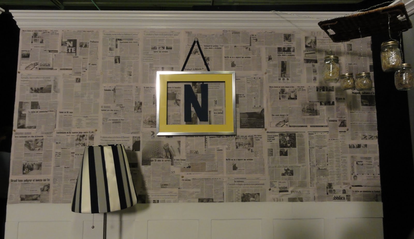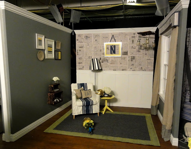 Tada! This is the room after we finished the show. We LOVED the way it turned out. I had the idea to use the foam core they gave us to do a board & batten treatment on the back wall, and Monica made that idea come to life! It added such a nice architectural detail for the focal wall. We also used the newspaper to create wallpaper- this is SO easy to do. Just spray the wall with spray adhesive and then give it a coat of matte mod podge to seal it all in. But forget all the good stuff, let’s chat about the elephant in the room; the mason jar disaster in the corner of the room: