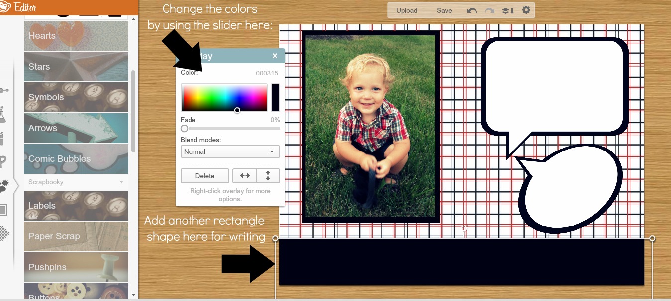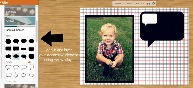Once I resized my picture to fit the “frame” beneath it, I started messing around with all the fun overlay options they have. I decided to go with comic bubbles for a fun kid element, and layered them again to create depth.