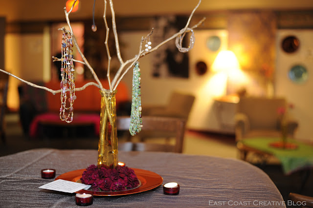 These babies were definitely our favorite feature of the room. We used chargers and vases from the Dollar Store, branches from our backyards that we spraypainted gold, and flowers from Produce Junction. But what really made them shine was the Worthwhile Wear jewelry we hung from the branches. They looked so cool, made a great conversation piece and helped to sell even more jewelry for the organization,