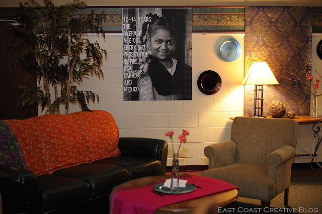 Unfortunately, the room had a pretty ugly border around the entire room that would have been too expensive to cover up, not to mention pretty difficult to do in a non-permanent way. We decided to use one of our other tricks, giant Staples Engineer Prints to deck out the walls and draw the eye away from the border. The prints of these gorgeous girls and women were taken while Dan was in India learning more about the culture and the great need for these girls to be rescued. Printed on each picture was a statistic of interest (most of them heart-breaking) related to human trafficking.