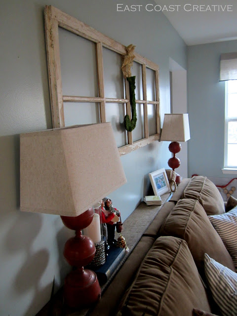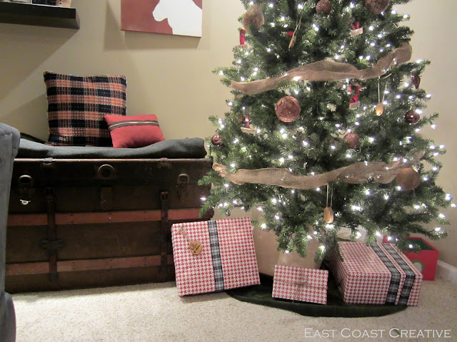 I recycled the Nate Show ornaments that Monica made for me last year (why buy new when the old stuff is so cute?!), and bought two adorable plaid pillows on clearance from Target to stick on top of my old thift store trunk. And of course, what makes the space is the reindeer sillouette art.