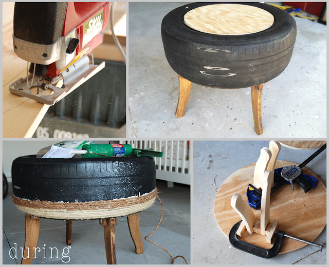 I started by giving the tire a scrub with some dish soap.  Next, I tried to figure out what to use for legs. Since this tire still has the (very!) heavy rim attached, I needed something sturdy. After contemplating many possibilities, I decided to cut them out of a piece of pine left in my garage from another project. The legs were stained and attached to a plywood circle I cut for the base. Then, I glued the tire on top of that with construction adhesive, and added a smaller circle to the top of the tire to act as the table top.