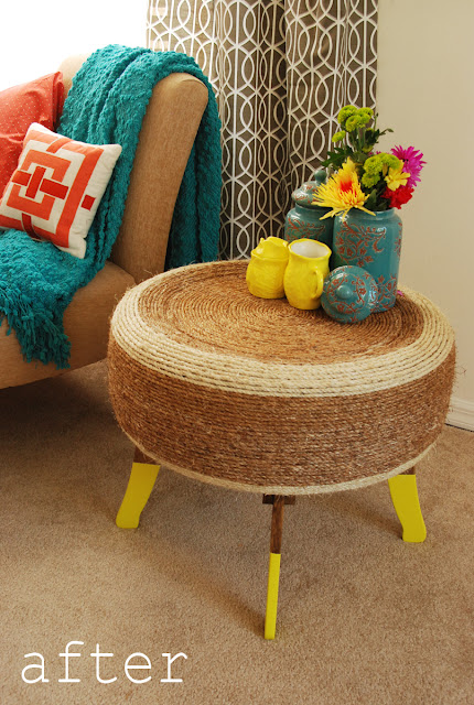 I covered the entire tire in rope using Liquid Nails and “dipped” the legs in a bright citrus-ey yellow paint. I’m pretty jazzed with how it came out and can’t wait to tell people I have an old tire in my living room. Ha!