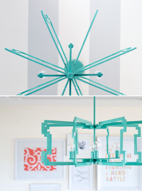 The egg crate diffuser was cut into the shape of the arms, filled with plaster of paris, sanded and painted. So that the wiring and housing wouldn’t compete with the outer arms, I made a simple fixture out of metal tubing, PVC plumbing parts, and a few parts from an existing chandelier. After wiring it (and being elated that it worked!) I installed trim on the ceiling to frame the chandelier, and added a little more interest by painting alternating stripes in ivory and a light gray. Finally, I installed a gallery wall with a few fun pieces!