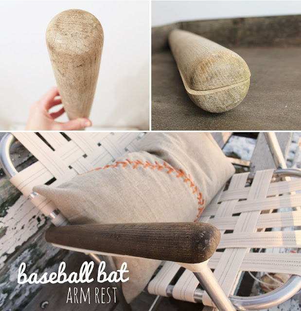 I added all new cream-colored webbing {with a navy pin stripe}, updated the arm rests by re-purposing an old wooden baseball bat, and made a baseball stitch pillow from an old table runner. I love how it all came together!