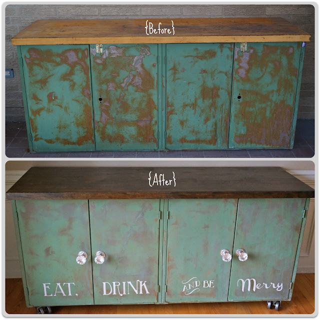 So, I did a little DIY-science-experimenting and discovered a technique to get just the look I was hoping for. After this process I added the casters, the door knobs, stenciled on the quote and stained the butcher-block top.