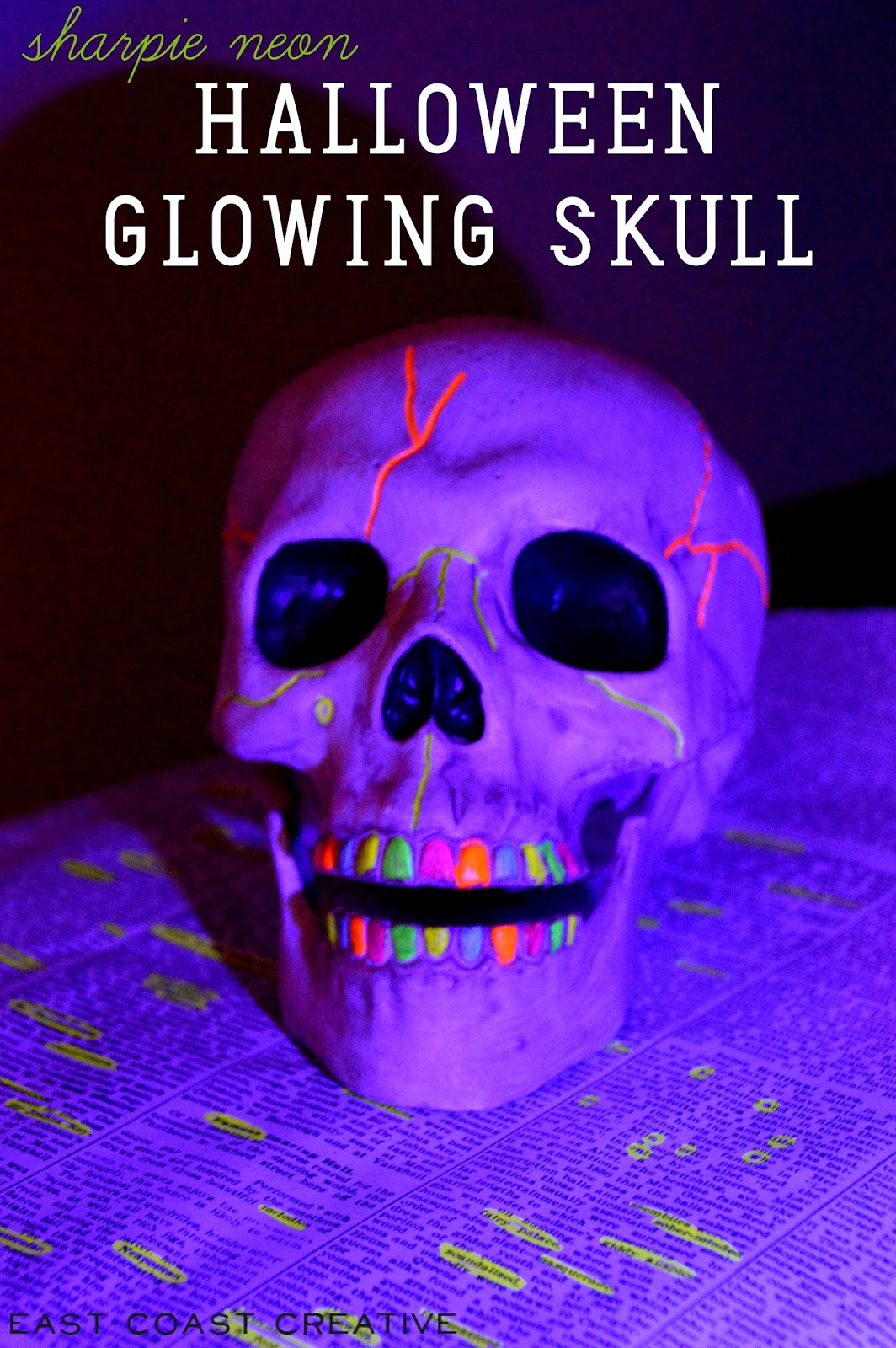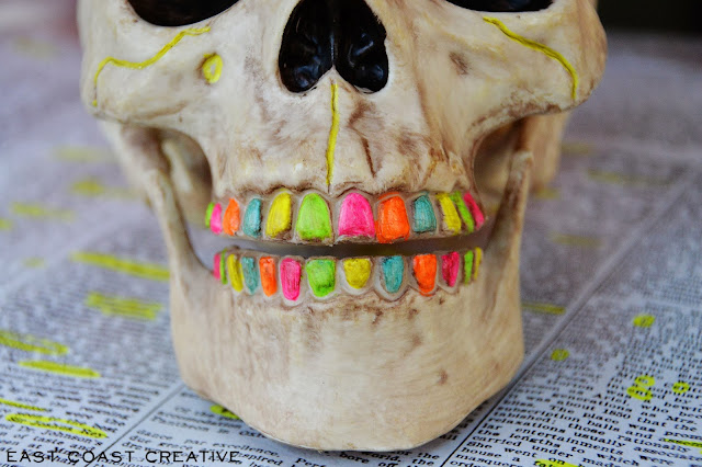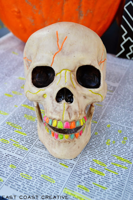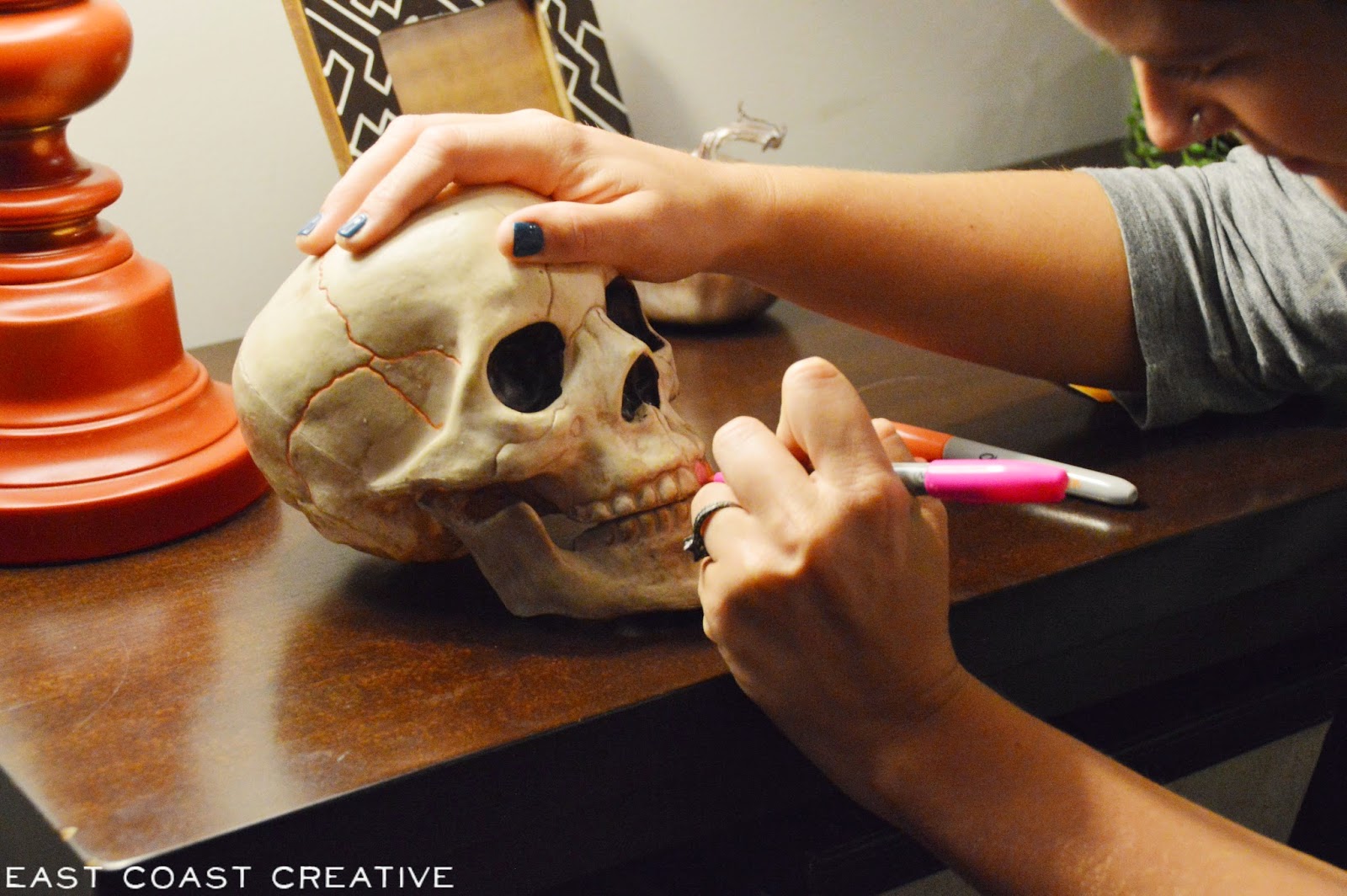 We have a bit of a “Not Too Scary” Halloween rule at the Mangin house. We’re all for having fun and dressing up, but we’re not into the darker, creepo side of the holiday. So, while I loved how authentic the skull looked, I knew I needed to pretty him up and my new Sharpie Neon markers that I bought at Target were just the thing I needed!