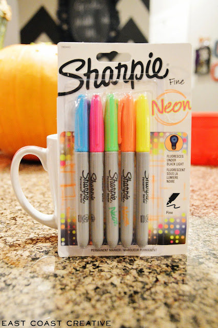 So, if you’re looking for some simple ways to decorate this Halloween, instead of dishing out big bucks, just grab a pack of Neon Sharpie markers at Target using this $1.00 off coupon (while supplies last in select stores) and add a POP to some items you already have around the house. You could add some style to plain, dollar store mugs, make a glowing pennant banner, and so much more! One added bonus… my kids thought I was the coolest ever when I showed them how the black light worked! For more ideas using Sharpies for Halloween check them out on Pinterest and Facebook.