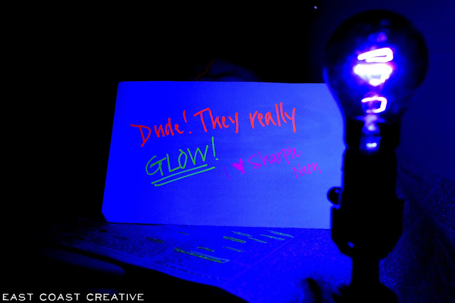 I had just watched the movie A Beautiful Mind and I thought making the plain paper look like it had hidden messages would be fun! It was amazing how easy it was to find Halloween-like words! And once again the Sharpie Neon under the black light added just the right pop to make it seem totally legit!